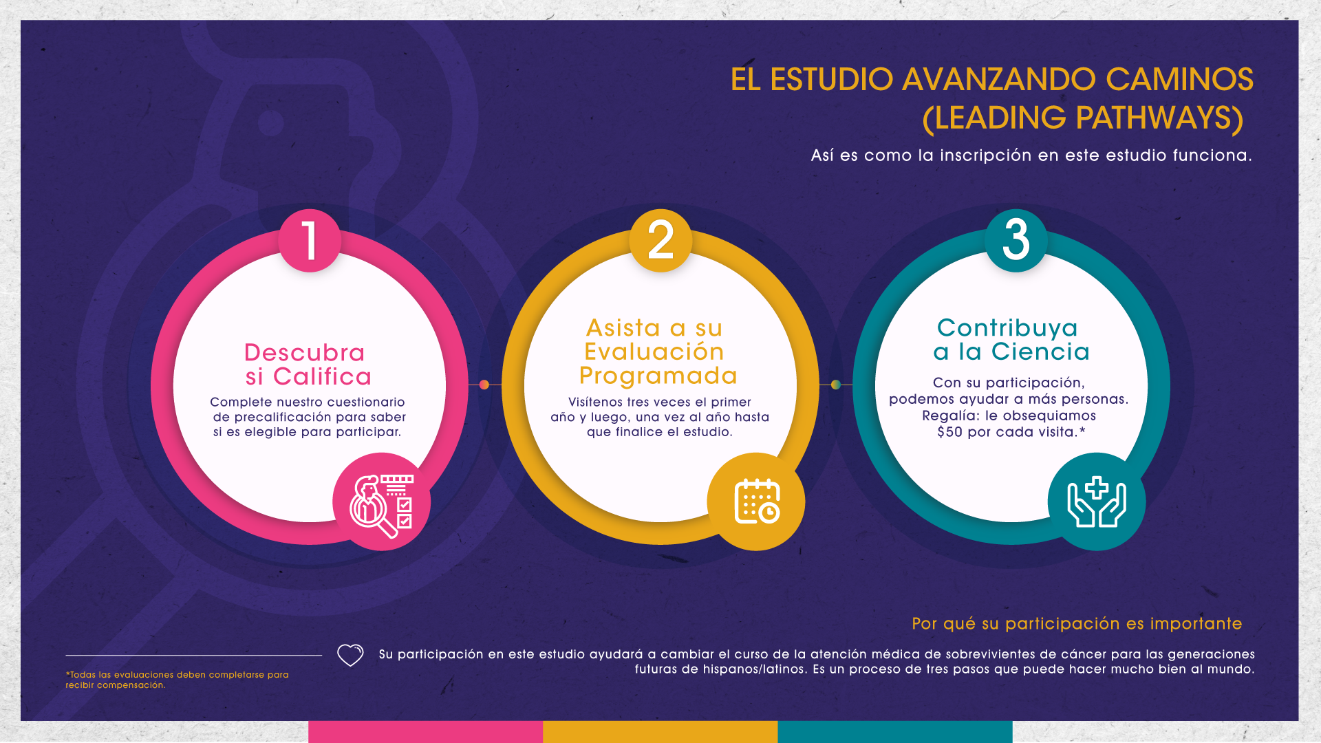 Avanzando Caminos (Leading Pathways): El Estudio de la Supervivencia del Cáncer en los Hispanos/Latinos es un estudio observacional de seis años que inscribirá a 3000 sobrevivientes de cáncer hispanos/latinos en el sur de Texas y el sur de Florida.